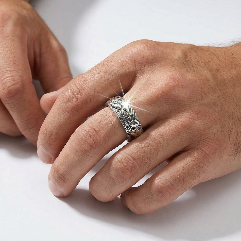 Кольцо Волчья стая выполнено из серебра 925 пробы с применением технологии - оксидирование (чернение).
